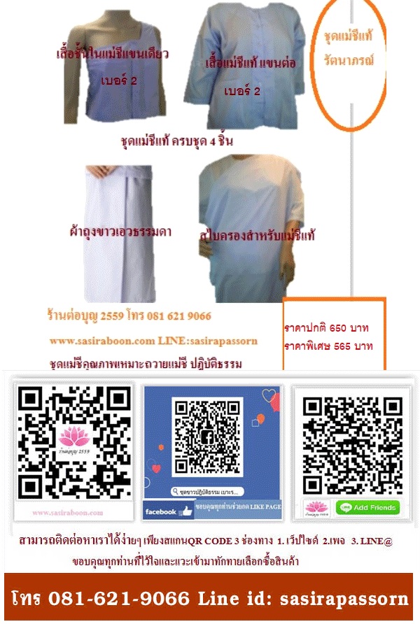 ร้านต่อบุญ 2559 โทร 081 621 9066 LINE:@917vcmwy จำหน่ายสังฆภัณฑ์ งานคุณภาพ ชุดขาวปฎิบัติธรรมท่านหญิง ท่านชาย สำหรับเด็ก เบาะรองนั่งสมาธิ อาสนะ สำหรับญาติโยมปฎิบัติธรรม อาสนะสำหรับพระภิกษุสามเณร จำหน่ายชุดสังฆฑทานด้ามมีดโกนขนนกและใบมีดโกนขนนก พระแก้วมรกต ทองคำเปลว ทองแผ่นดวงโภคทรัพย์ เต็นท์มุ้งนั่งสมาธิจัดชุดสังฆฑานด้ามมีดโกนพร้อมมีดโกนตราขนนก รองเท้าพระอย่างดี สังฆภัณฑ์อย่างอื่นสอบถามได้คะ
